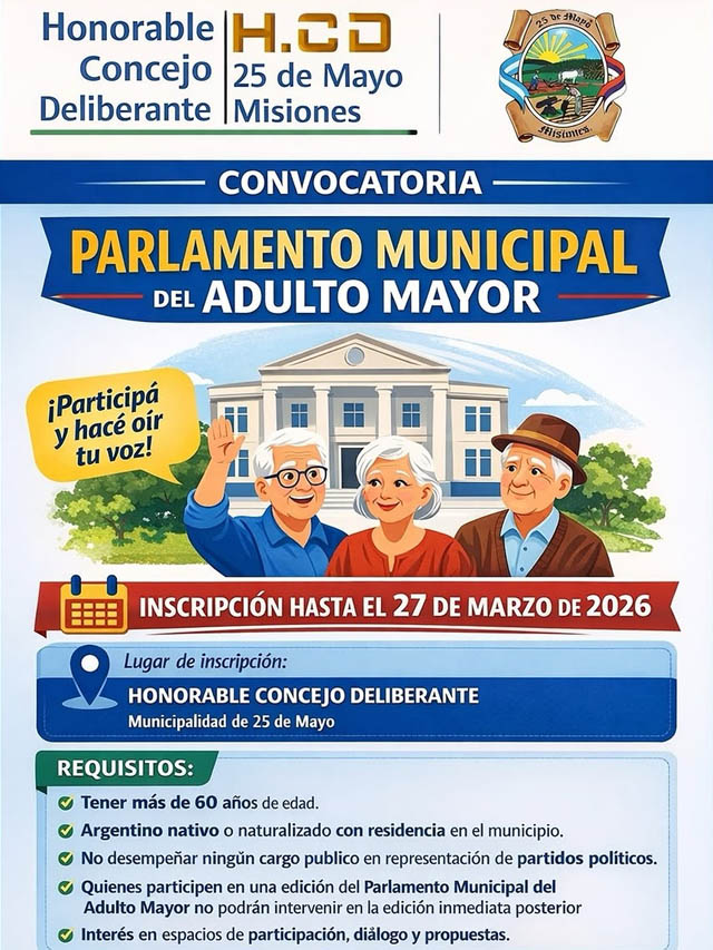 AGENCIA MISIONES.UNO | El Honorable Concejo Deliberante de 25 de Mayo lanzó la convocatoria para participar del Parlamento Municipal del Adulto Mayor, un espacio de participación ciudadana destinado a que las personas mayores puedan expresar ideas, propuestas y necesidades para mejorar la comunidad.